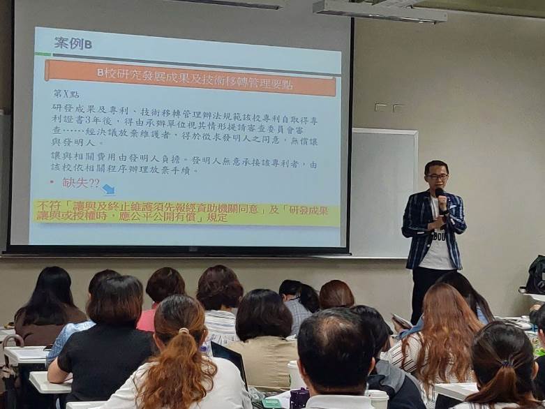2019年TIPA與教育部合作辦理「大專校院技轉研發人員專班」,臺南場圓滿落幕。 活動名稱:大專校院技轉研發人員專班 日期:2019年7月10日(星期三)-7月12日(星期五)9:00至16:30 地點:國立成功大學資訊工程學系新館1樓65105普通教室(台南市東區大學路一號,靠近長榮路3段及大學路口) 議程:請參閱檔案下載。 課程花絮紀錄如下: 7月10日上午9:00-12:00,學研機構創業、衍生事業實務與法規,許華偉科長 7月10日下午13:30-16:30,學研機構智財管理及技轉相關法規,許華偉科長 7月11日上午9:00-12:00,學研機構專利申請與勤勉查察實務,管中徽助理教授 7月11日下午13:30-16:30,產學合作與技術授權合約設計與逐條釋義,陳聰富教授 7月12日上午9:00-12:00,智財權修法後對學研機構智財管理及運營影響,許曉芬副教授 7月12日下午13:30-16:30,學研機構智財營運實務,陳黛君協理
